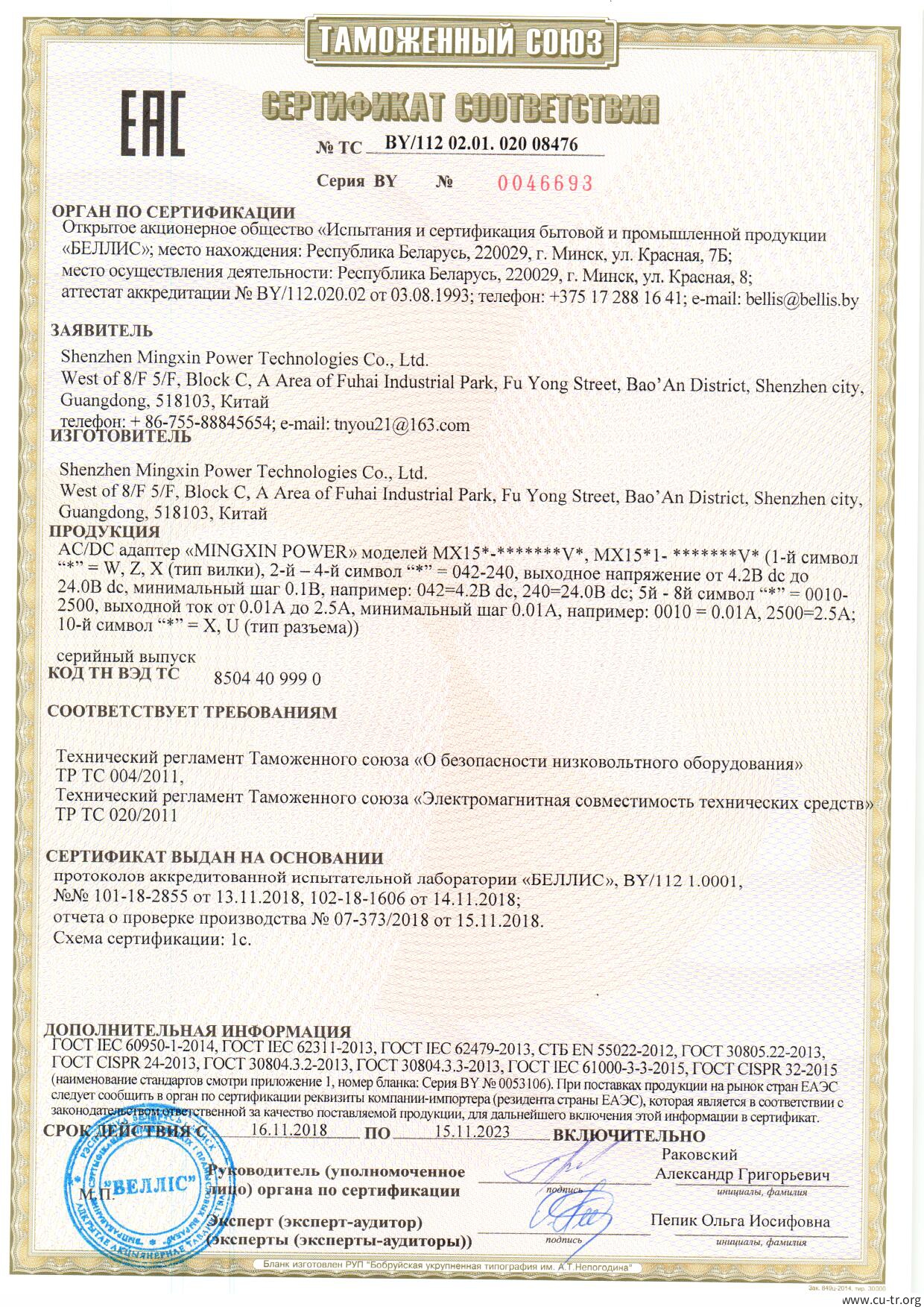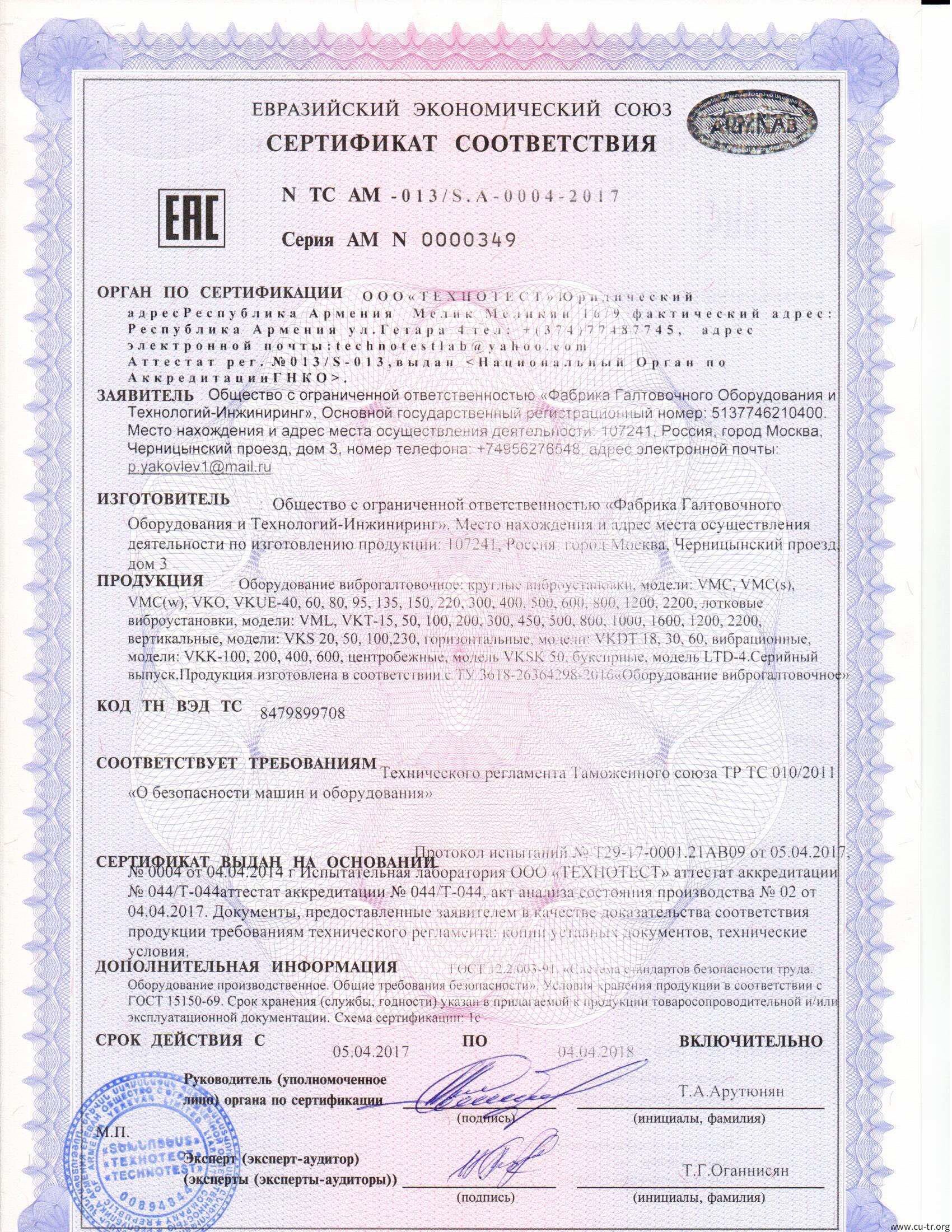 CU-TR合格证书(EAC)СЕРТИФИКАТ СООТВЕТСТВИЯ ТР ТС (ТР ЕАЭС)