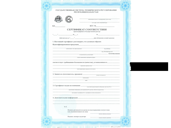 The Republic of Kazakhstan Certificate of Conformity is a document certifying that products comply with the requirements of the Republic of Kazakhstan legislation in the field of technical regulation, i.e. it is a document of conformity in the GOST Kazakhstan system. It is required for exporting products to Kazakhstan and Russia. The presence of this certificate indicates that all standards and regulations have been met in accordance with the requirements of technical regulations.